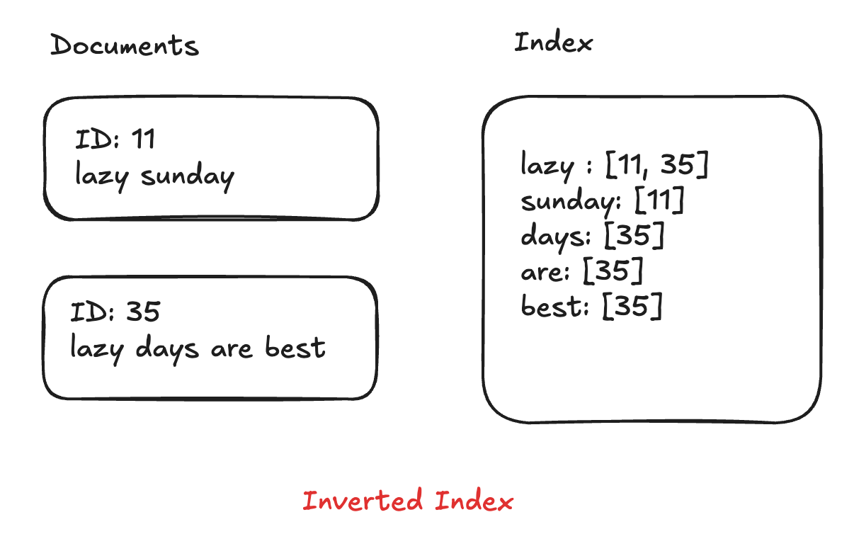 "great" -> [document #12, document #53, ...]Now, instead of having to look through every single book to see if the title contains "great," we can just look up "great" in our inverted index and BAM! We instantly know which documents have it.
